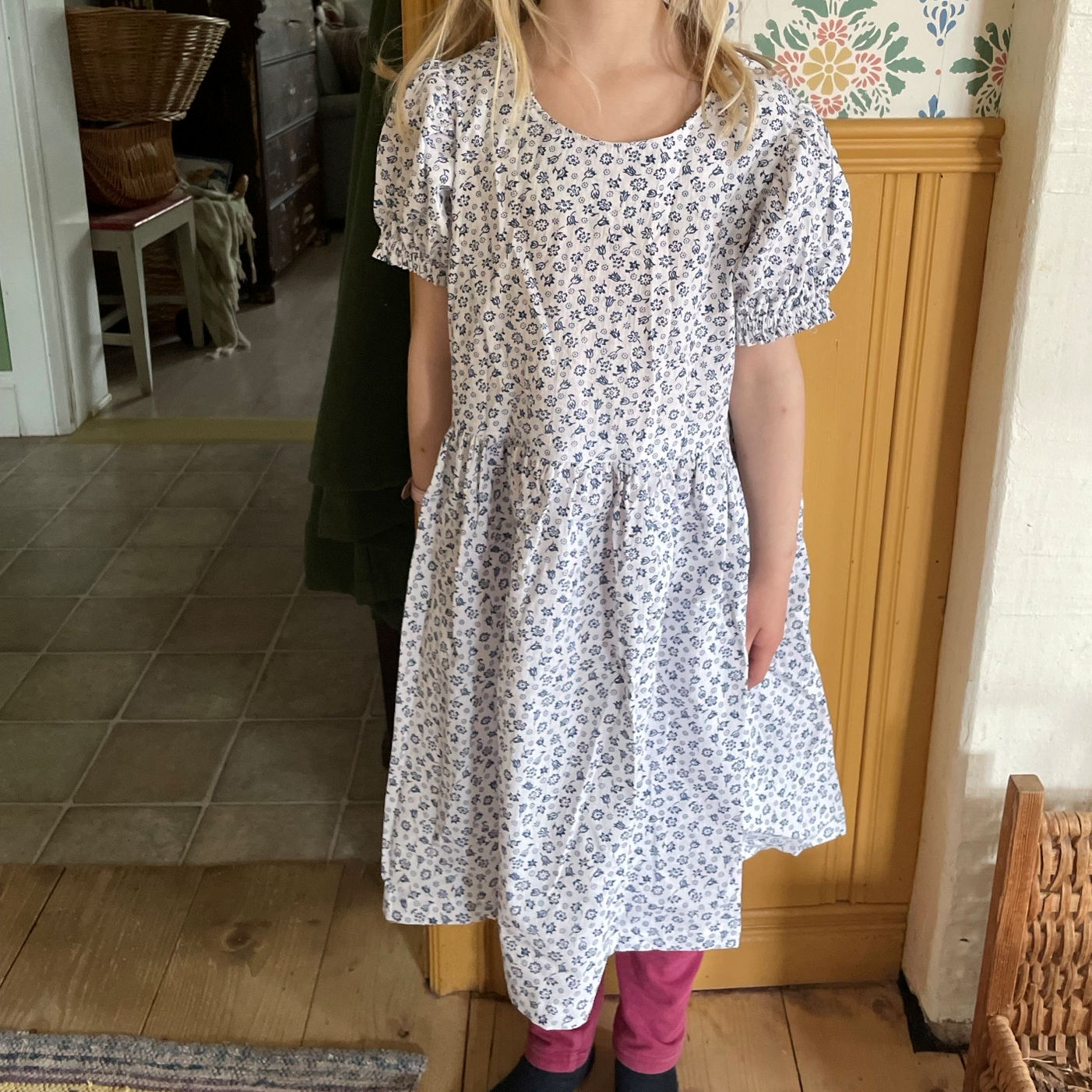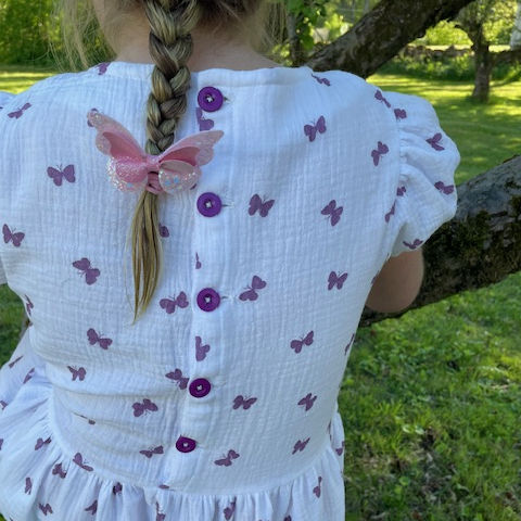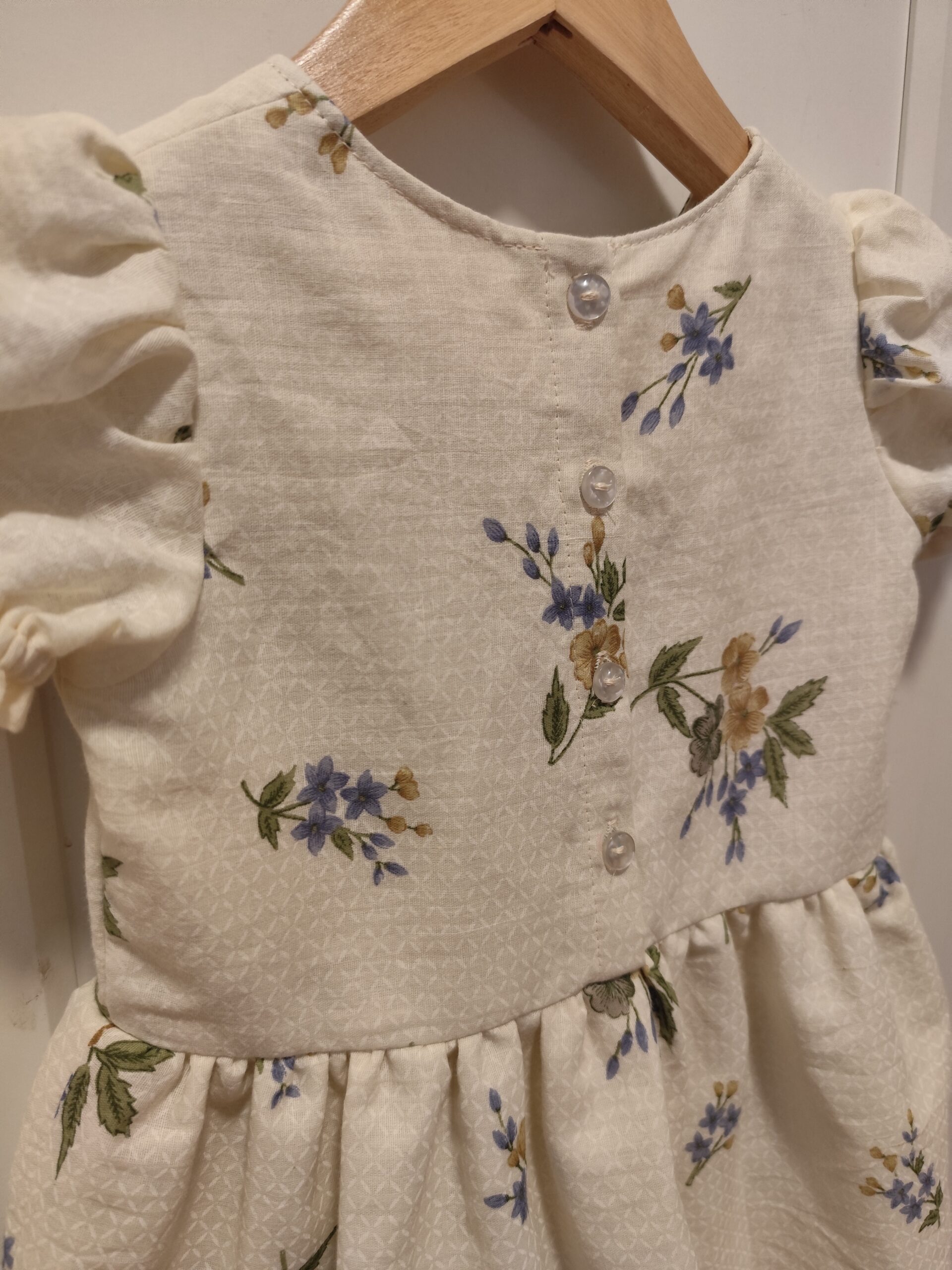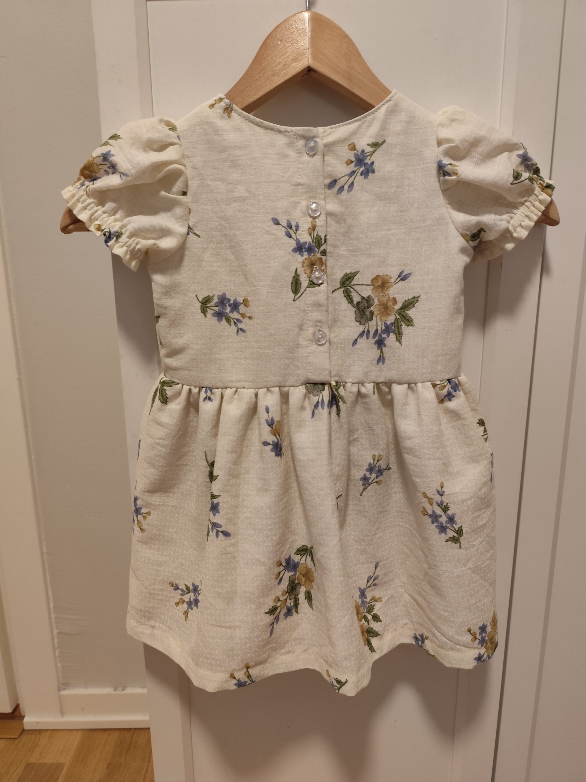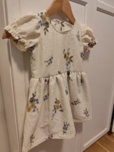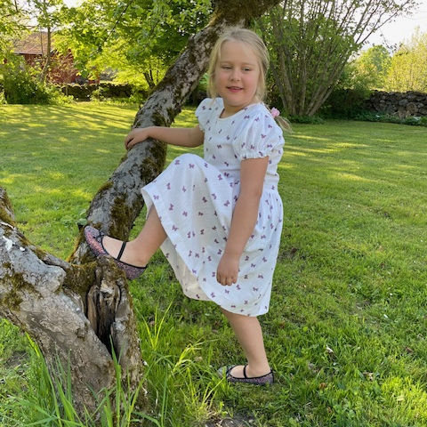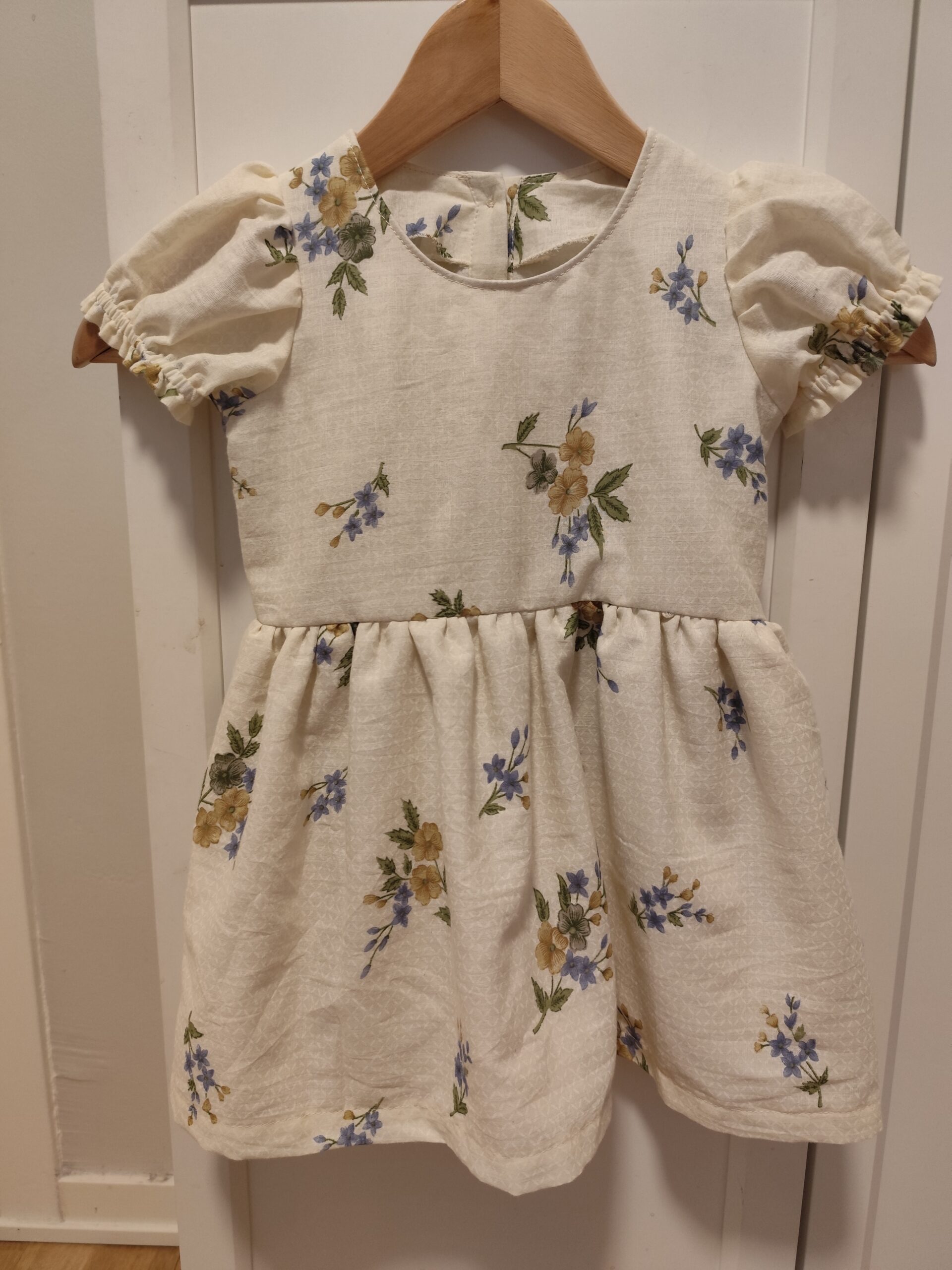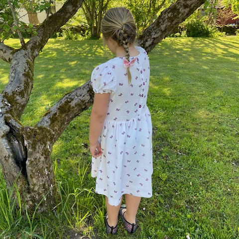 Jag sydde den här klänningen i storlek 92 och resultatet blev jättebra. Jag är nybörjare på att sy och tyckte det enda svåra i beskrivningen var hur man skulle göra vid halsen, men jag tror det blev rätt. Det var roligt att sy den här klänningen och den blev som jag hade tänkt mig!