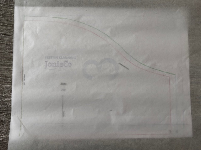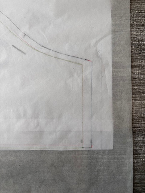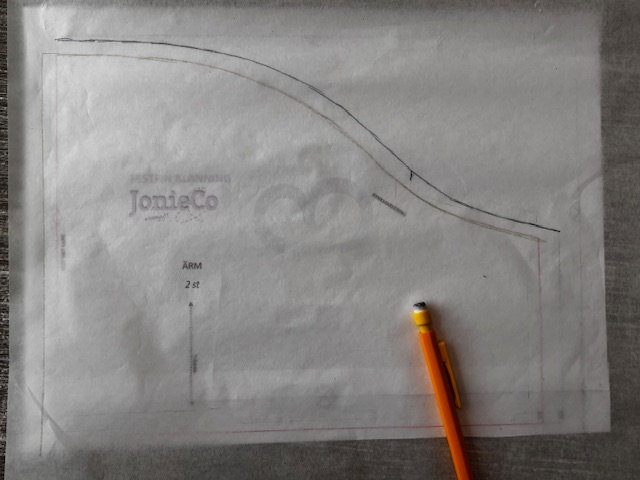 Ritar av storlek 122, flyttar det till 116, ritar av 122 igen som ny storlek, flyttar tillbaka 122 till sitt egen streck på mönstret och kompletterar med del av linje som saknas.