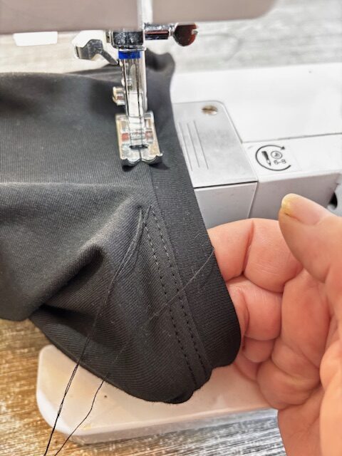 Backa inte när du syr med tvillingnål. Lämna istället minst 1 dm tråd i början och slutet av varje söm. Knyt sedan en dubbelknut på trådarna som ligger i samma spår på rätan samt de trådar som är på avigan. Dra sedan igenom trådarna på rätan till avigan med hjälp av en synål. Knyt sedan ihop alla trådarna med dubbelknut och klipp sedan av trådarna.
