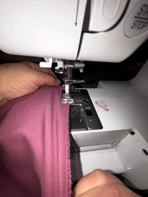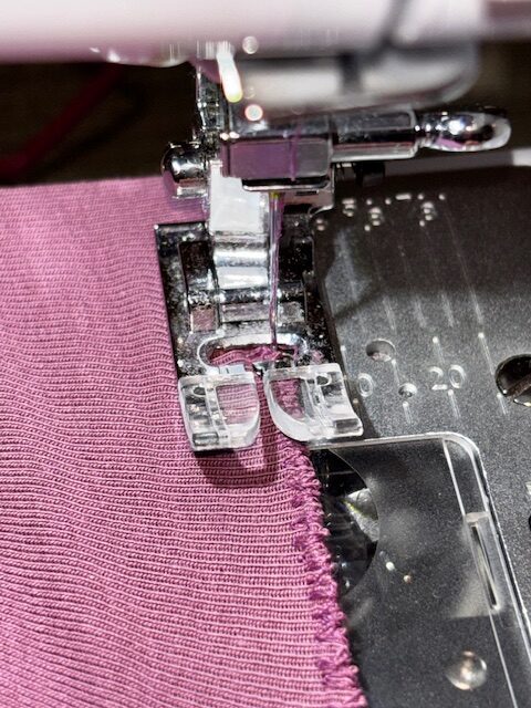 Sträck på tyget både före och efter pressarfoten och sy med låg hastighet längs hela kanten. Se till att den yttersta nålpositionen hela tiden slår ner precis utanför tyget.